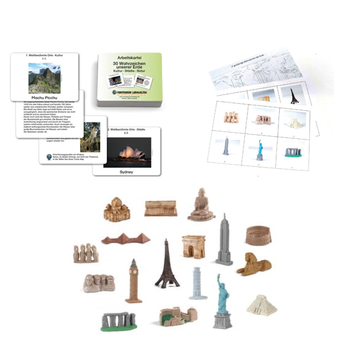 Die 17 Figuren der Wahrzeichen der Welt stellen plastisch einige fantastische Höhepunkte der menschlichen Kultur dar. In diesem Set werden Sie um ein passendes Quiz und eine Arbeitskartei ergänzt.