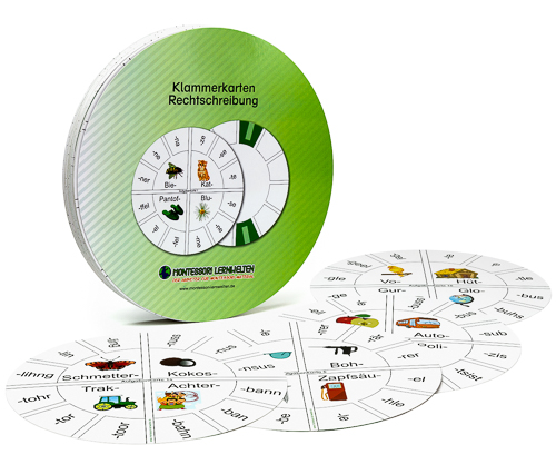 Jede Klammerkarte zeigt 4 Bilder. Die Kinder sollen jeweils die richtige Wortendung “klammern”. Mit rückseitiger Selbstkontrolle.