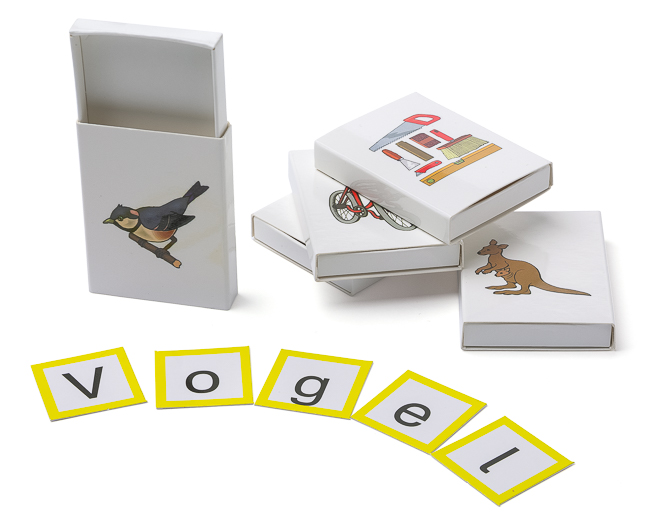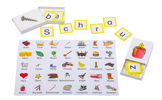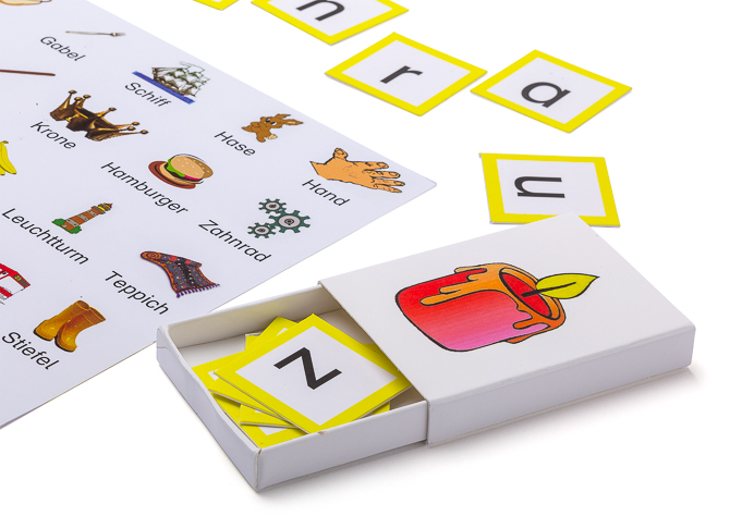 Buchstabenkarten inklusive bebilderter Lesedosen und einer Lernkontrolltafel. Buchstabieren, Erstlesen und Erstschreiben