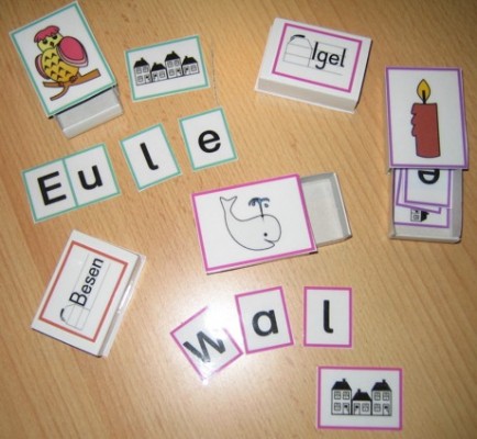51 Lesedosen mit Selbstkontrolle auf der Unterseite der Dosen. Zusatzlich liegen Wörterhäuser bei, die als Hinweiskarten dienen.