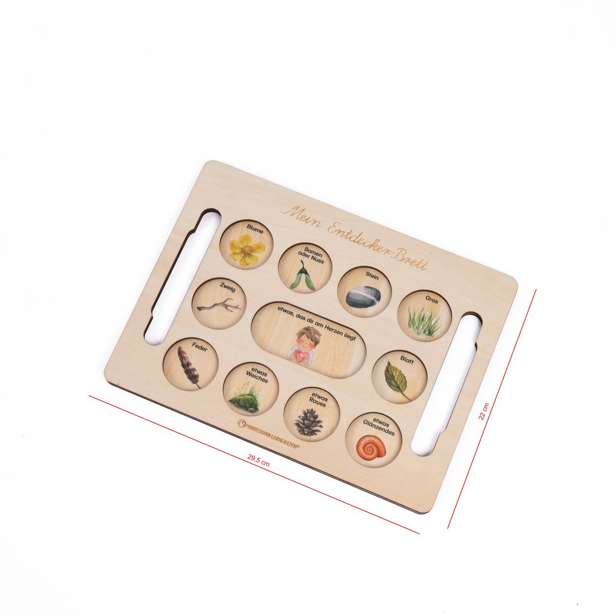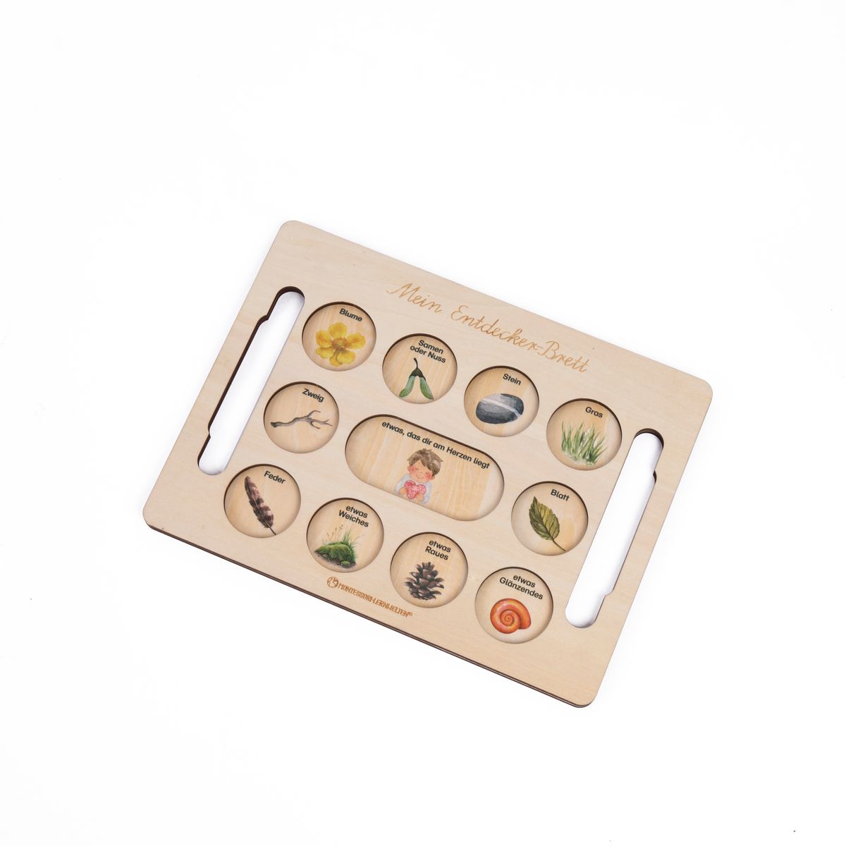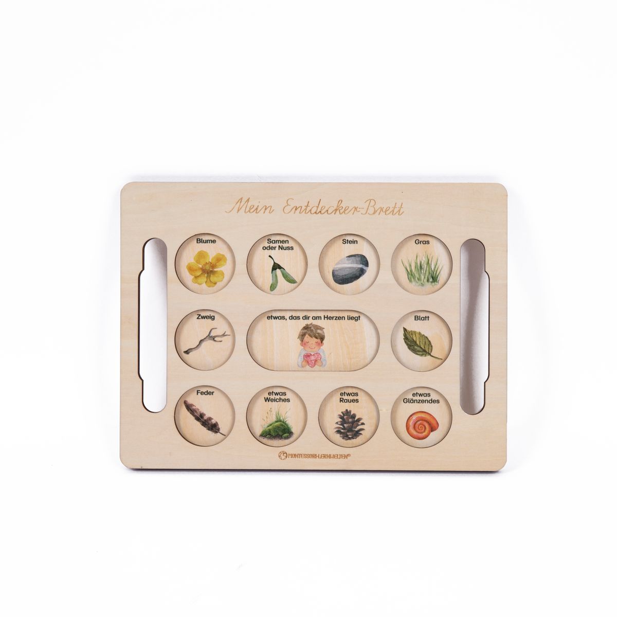 Dieses liebevoll gestaltete Entdeckerbrett aus hellem Holz lädt Kinder dazu ein, ihre Umwelt bewusst wahrzunehmen und mit allen Sinnen zu erforschen. Die runden Vertiefungen bieten Platz für kleine Naturschätze wie Blüten, Samen, Steine oder Federn und machen das Sammeln und Sortieren zu einer ruhigen und geordneten Tätigkeit.