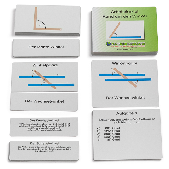 Diese Arbeitskartei ist überwiegend eine Lehrkartei, die alle Arten von Winkeln und Winkelpaaren genau vorstellt.
