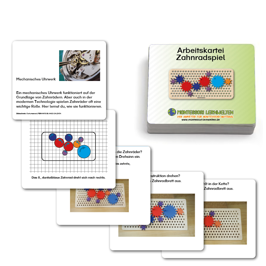 Die Arbeitskartei zum Zahnradspiel schult in drei verschiedenen Aufgabentypen das räumliche, logische und mechanische Denken der Kinder.