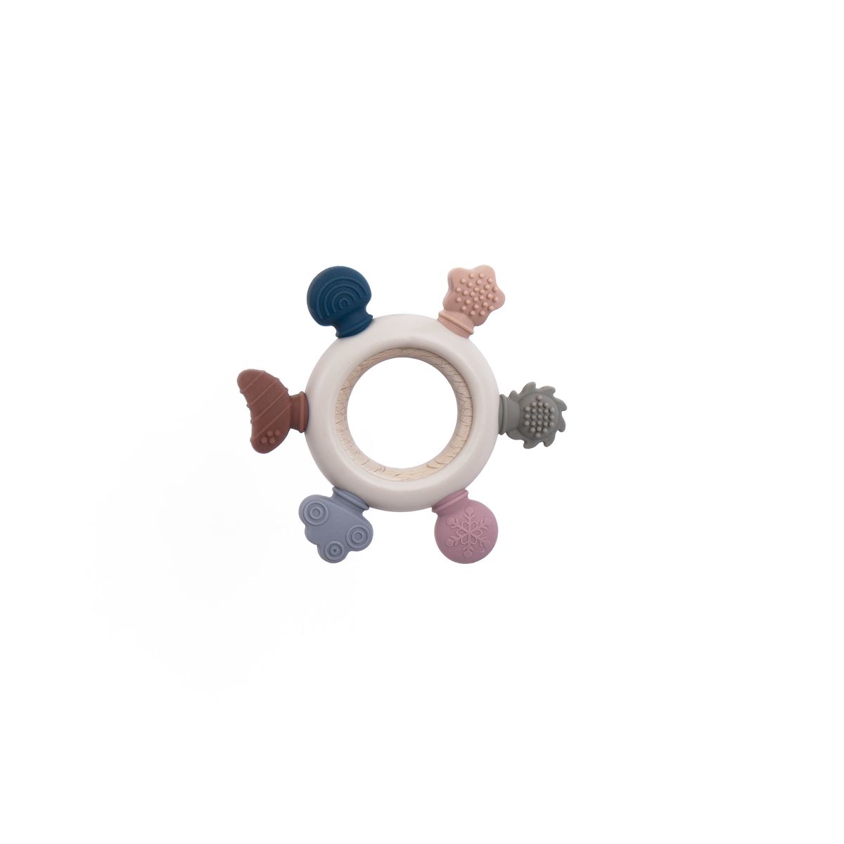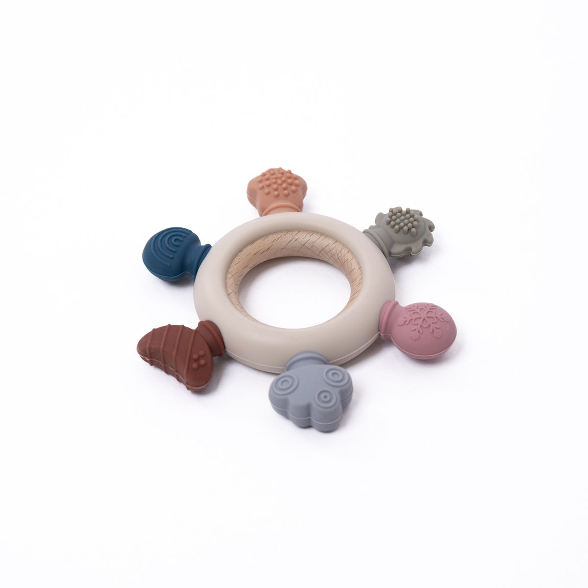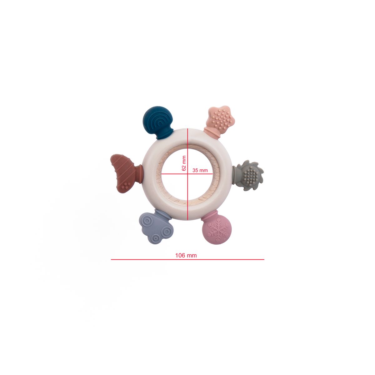 Unser Beißring bietet dem Baby sechs Elemente an einem Ring an, die sich in Farbe, Form und Oberfläche unterscheiden. Sie sind aus Silikon gefertigt, das den Kiefer des Babys beim Nuckeln und Beißen sanft massiert und dadurch das Zahnen erleichtert.