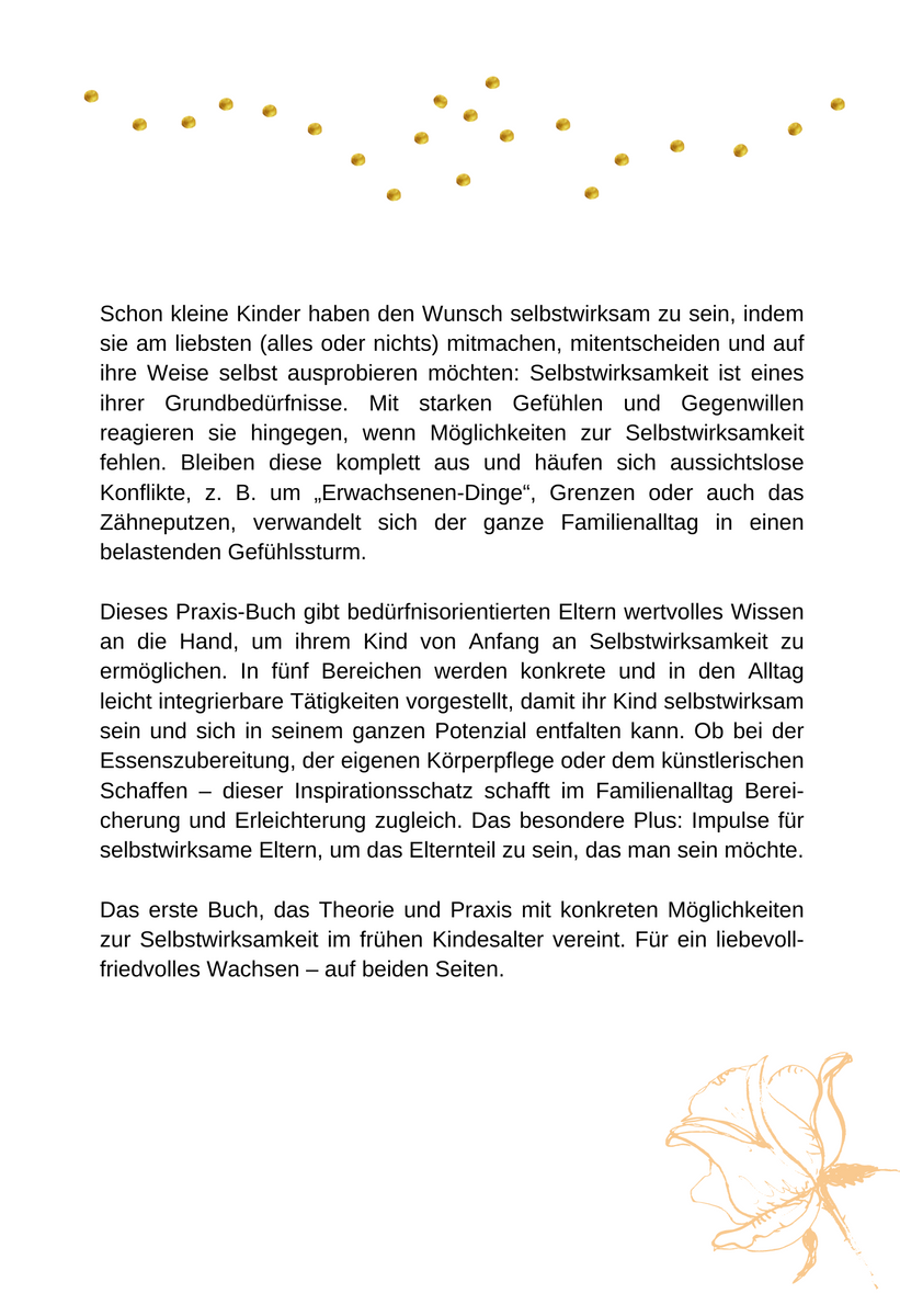 Dieses Praxis-Buch gibt bedürfnisorientierten Eltern wertvolles Wissen an die Hand, um ihrem Kind von Anfang an Selbstwirksamkeit zu ermöglichen.