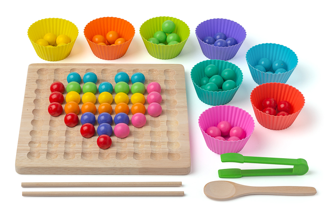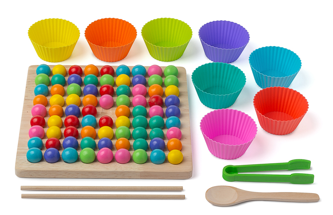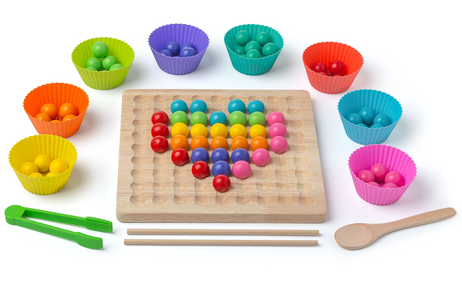 Clip Beads sind eine großartige Alternative zu Videospielen und machen mindestens genauso viel Spaß. 80 quietschbunte Kugeln auf einem Holzbrett laden dazu ein, mit den Fingern, mit einer Pinzette, mit Essstäbchen oder mit einem Löffel vorsichtig bewegt zu werden.