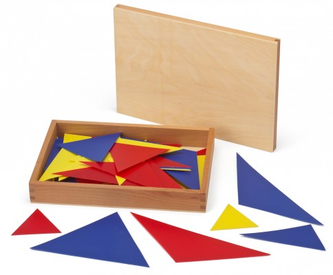 Holzkasten mit 63 Dreiecksformen für Übungen zur Wortart Adjektiv