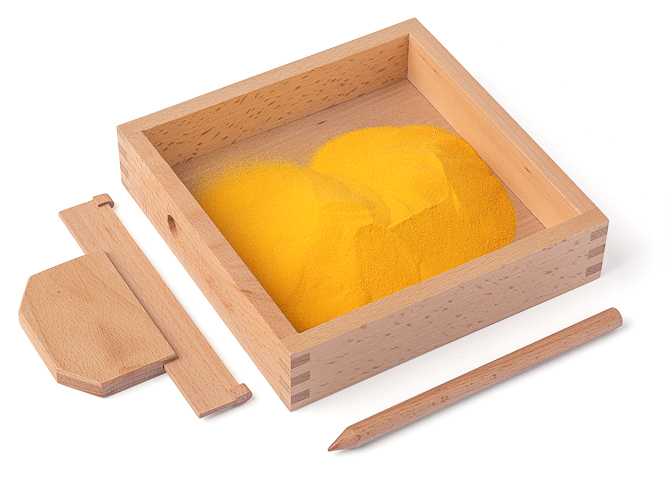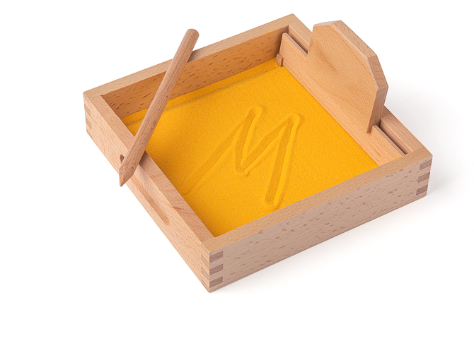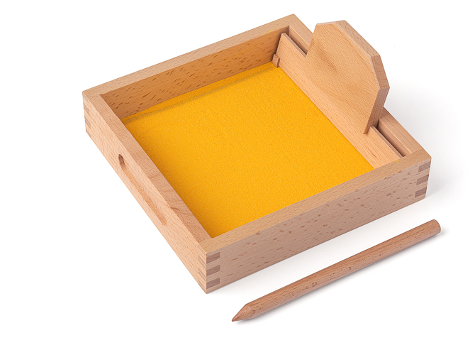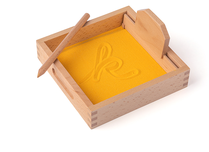 Das kompakte, solide Tablett gefüllt mit gelbem Sand lädt zum Malen und Schreiben ein.