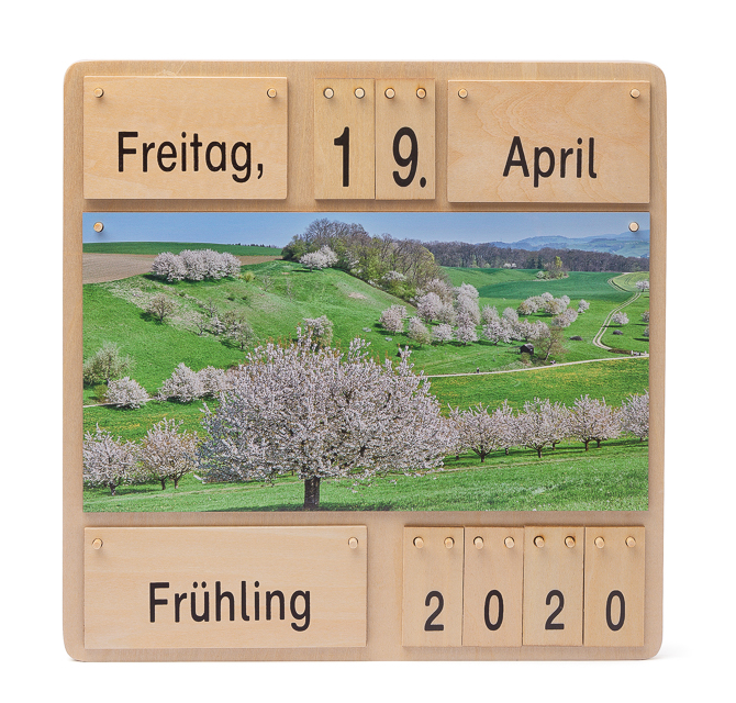Ein toller Holzkalender mit Jahreszeitenbildern, der es ermöglicht sich täglich mit dem richtigen Einstellen von Tag, Monat, Jahr und Jahreszeit zu beschäftigen.