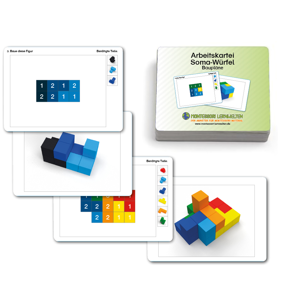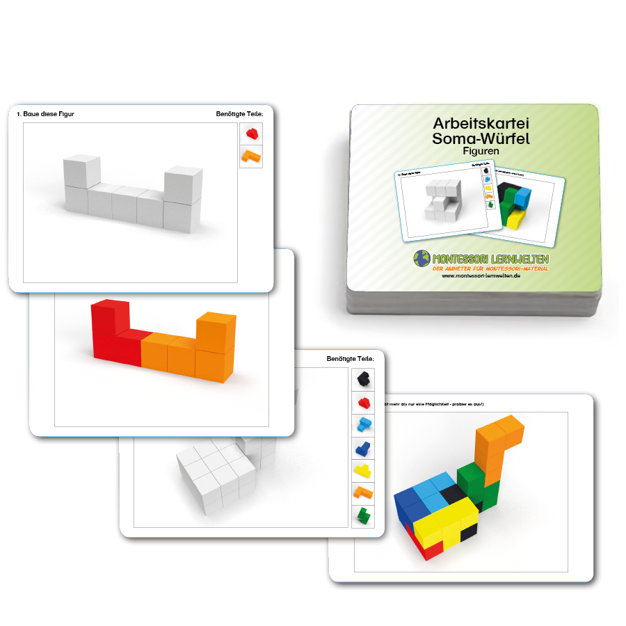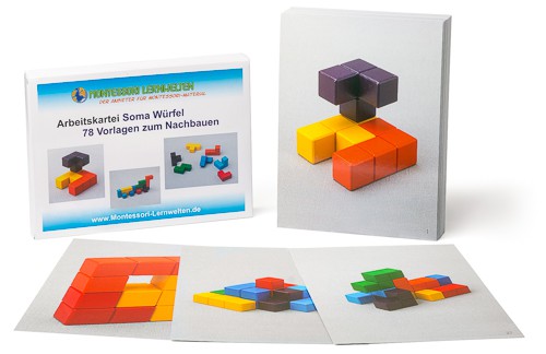 Das Komplettpaket für die Arbeit mit dem Soma-Würfel. Ein Somawürfel mit drei vielseitigen Arbeitskarteien. Mit dem Soma-Würfel lassen sich mehr als 240 Figuren nachbauen. Dieses 3D-Puzzle aus Holz hilft das räumliche Vorstellungsvermögen zu trainieren und bietet die Möglichkeit, Geometrische Körper zu legen und zu bauen.