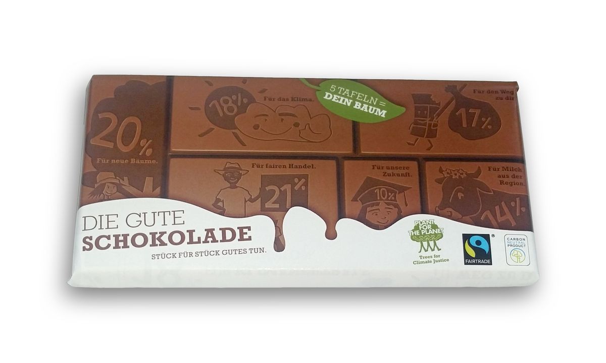 Für 5 verkaufte Tafeln der guten Schokolade wird ein neuer Baum gepflanzt. Die Gute Schokolade ist nicht nur gut, sondern laut Stiftung Warentest sogar die beste Vollmilchschokolade! (12/2018)