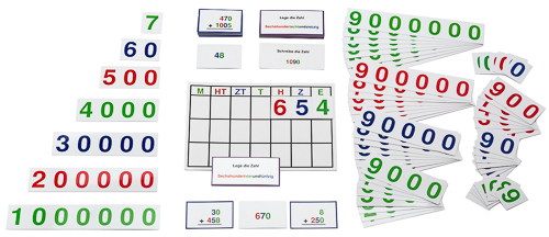 Komplett fertiges Lernmaterial mit Aufgabenkarten, Stellenwerttabelle und Zahlenkarten von 1 bis 10 Millionen.