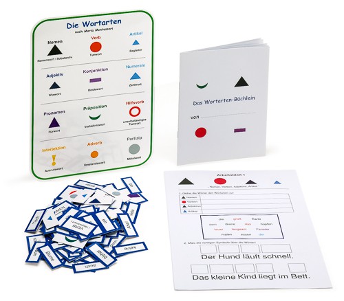 141 Legekarten zu 11 Wortarten mit rückseitiger Lernkontrolle, ein Büchlein und eine Wortartenübersicht.