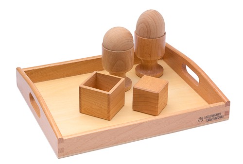 Dreidimensionale Kugel, Ei und Kubus auf einem Holztablett