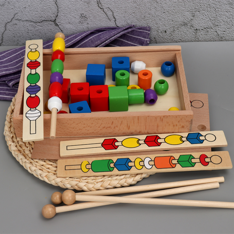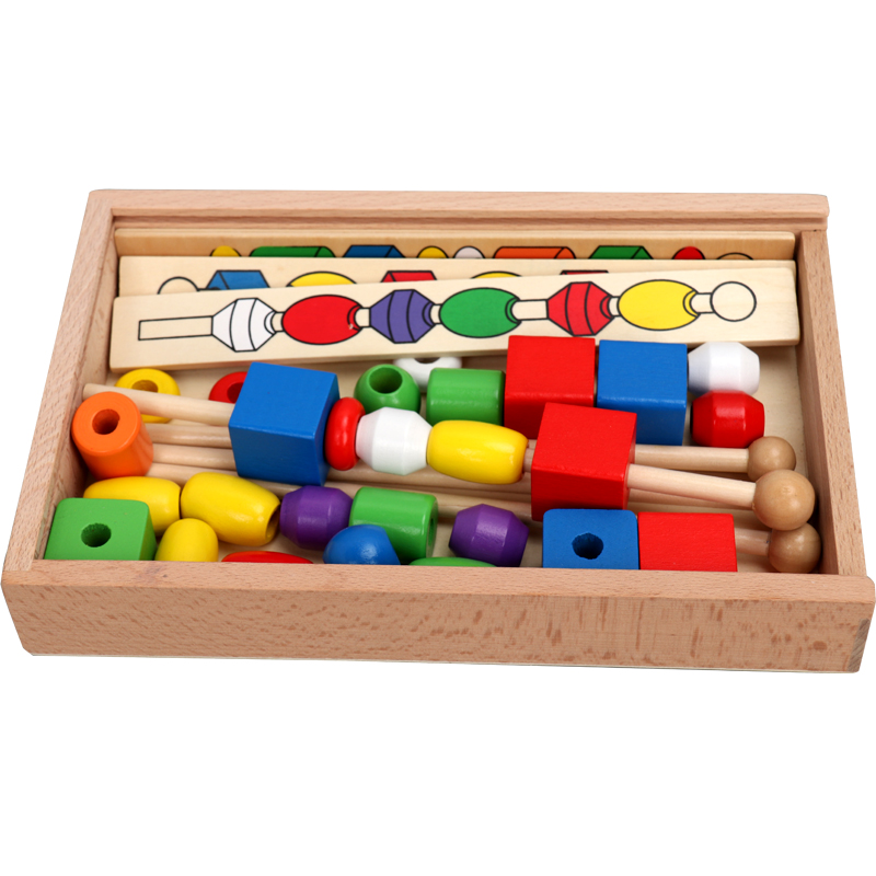 Dieses Fädelspiel ist eine runde Sache. Perlen, Stäbchen und Aufbewahrungsbox sind aus Holz gefertigt. Sogar die Fädelvorlagen sind auf Holzbrettchen gedruckt.