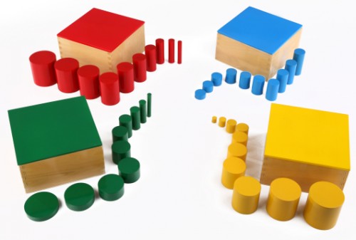 4 Kästen mit jeweils 10 Zylindern zur Schulung der Motorik und zum Erkennen von Seriengesetzen.