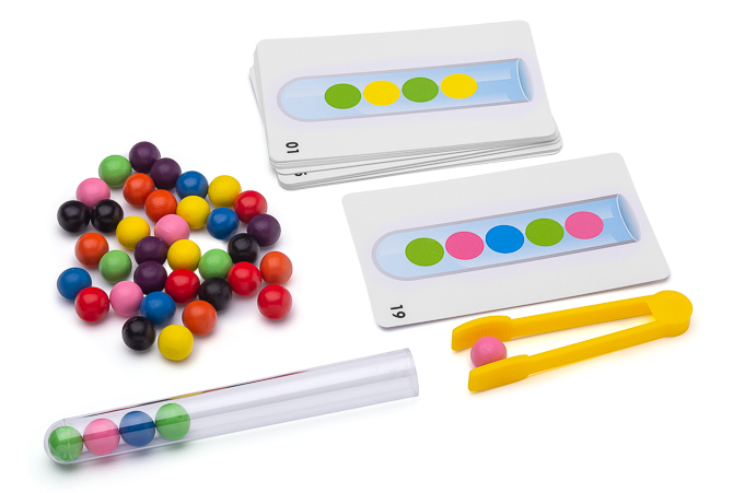 Diese kleine Lernwerkstatt schult die Hand und zugleich die Auffassungsgabe des Kindes. Mit einer Pinzette werden bunt lackierte Holzkugel aufgehoben und in ein Reagenzglas gefüllt.