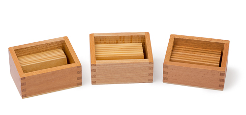 Entwicklung des Barischen Sinnes und der Motorik. 3 Kästen mit je 7 Gewichtstäfelchen.