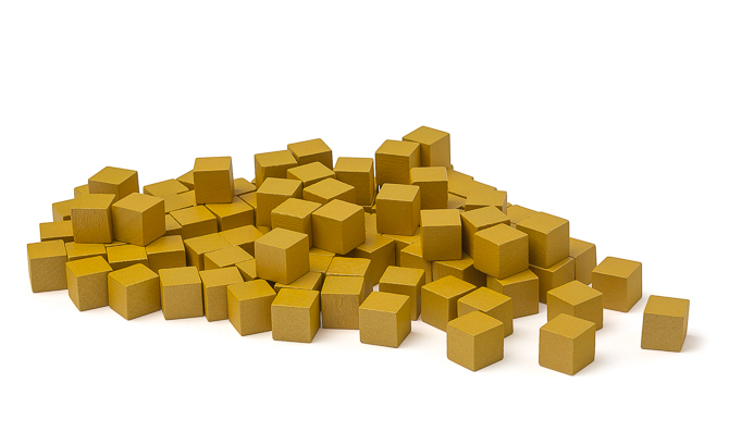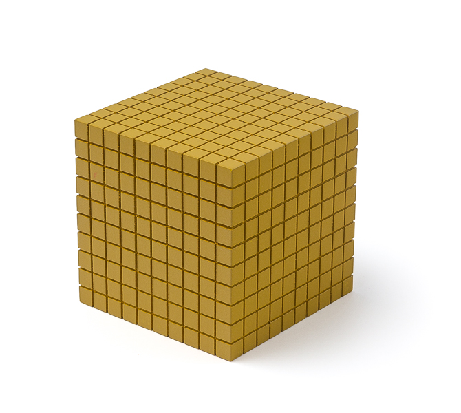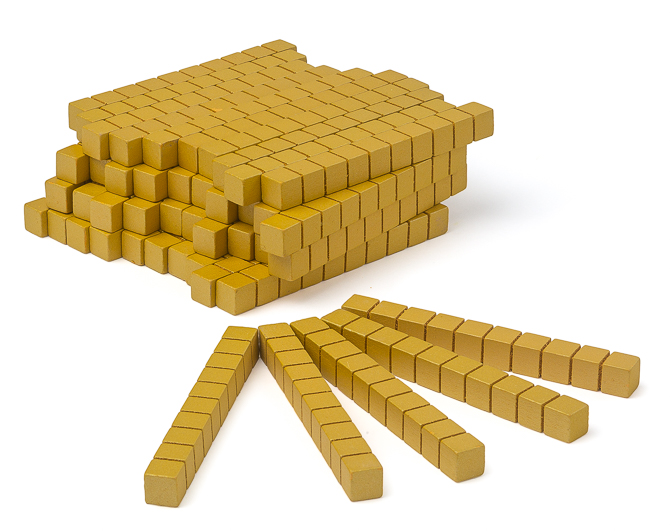 Das Goldene Würfelmaterial vermittelt auf beeindruckende Weise nicht nur die Anzahl der Würfel einer Zahl bis 2.600, sondern durch das besondere Material auch deren Wertigkeit.