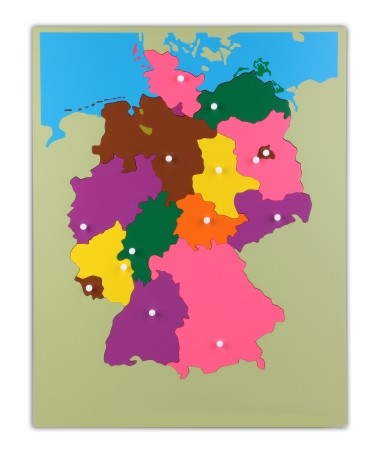 Holzpuzzlekarte zu den deutschen Bundesländern mit herausnehmbaren Staaten in der Größe 57 x 44,5 cm.