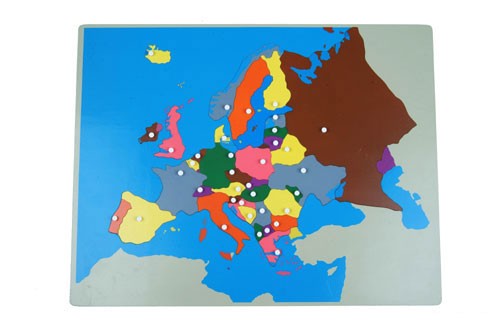 Großes Holzpuzzle, dass die herausnehmbaren Länder Europas darstellt und deren Lage und Fläche verdeutlicht.
