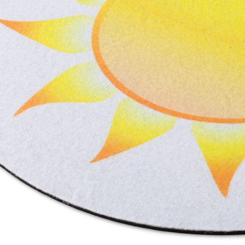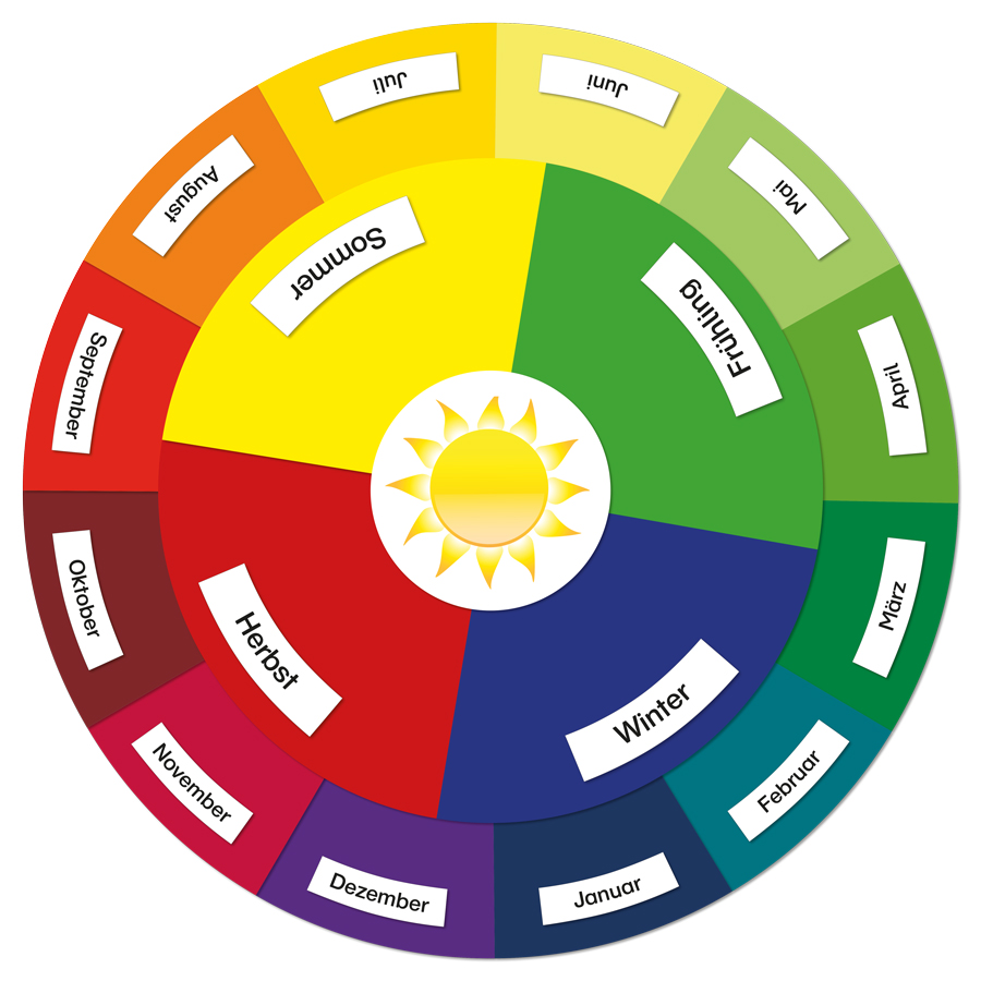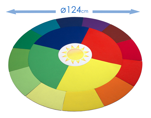 Jahreskreisteppich aus hochwertigem, Material. 3,5mm stark und 124 cm im Durchmesser. Die 4 Jahreszeiten werden in den Farben grün, gelb, blau und rot dargestellt.