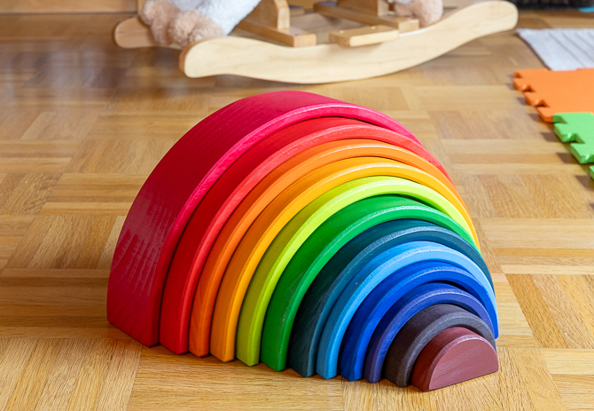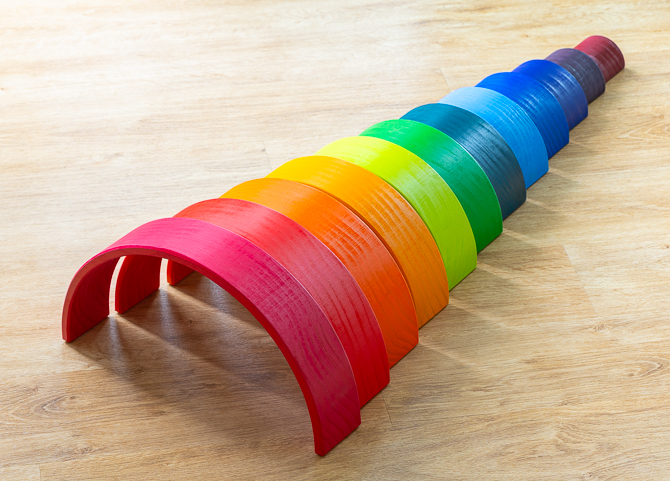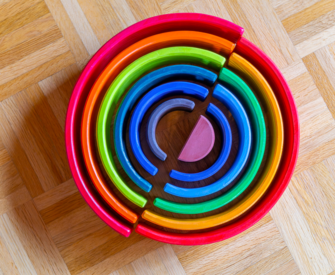 Zwölf farblich aufeinander abgestimmte Bögen lassen sich der Größe nach perfekt ineinander schachteln. Dabei trainiert das Kind sowohl seine Farbwahrnehmung als auch sein Gefühl für die Größe eines Gegenstandes.