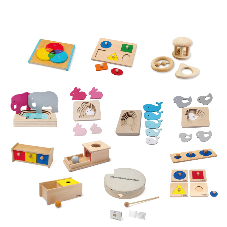 Unsere Grundausstattung für Kleinkinder von 3 bis 18 Monate umfasst 13 vielseitige Lernmaterialien, die allesamt eine Aufforderung oder Aufgabe stellen und die Auge-Hand-Koordination des Kindes fördern.