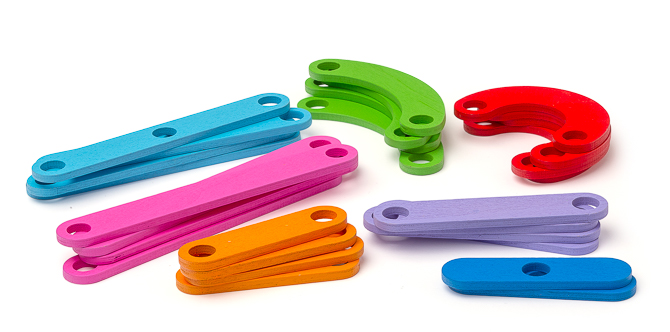 Das farbenfrohe Puzzle oder Steckspiel aus Holz besteht aus einem naturfarbenen Holzbrett mit neun Stäbchen und 26 bunten Steckteilen. Das Spiel ist so gut ausgetüftelt, dass sich damit nicht nur alle Buchstaben und Ziffern, sondern auch eine große Zahl symmetrische und asymmetrische Formen legen lassen.