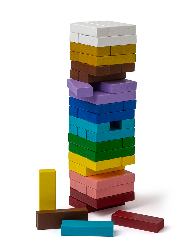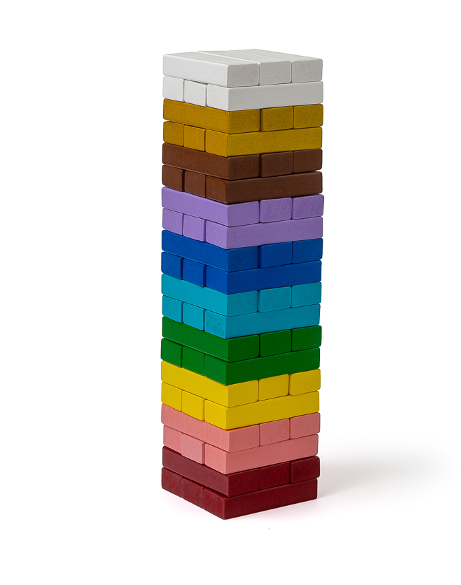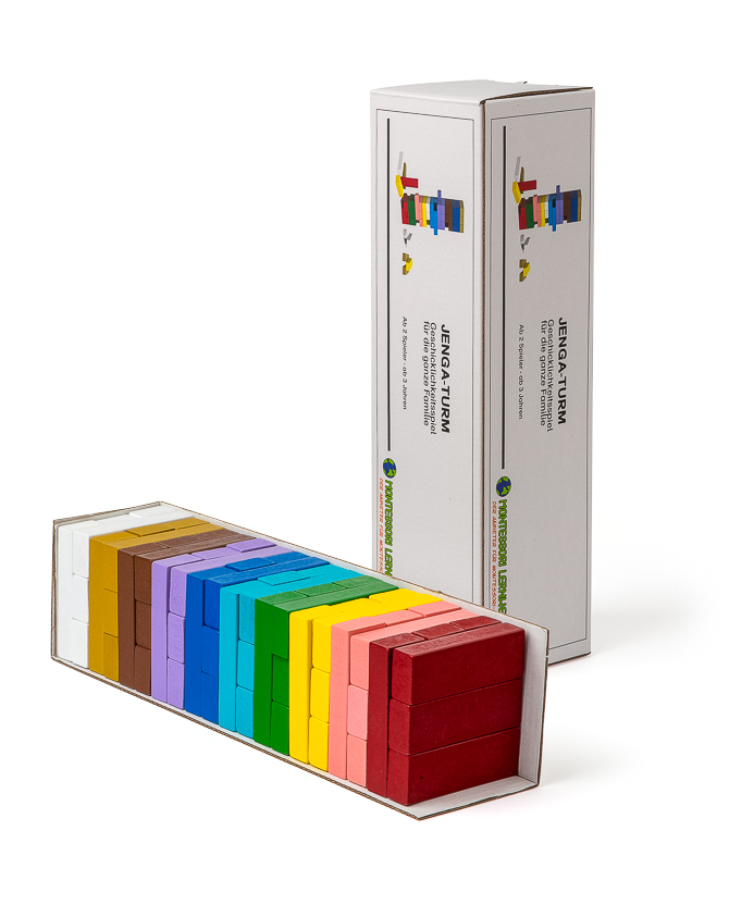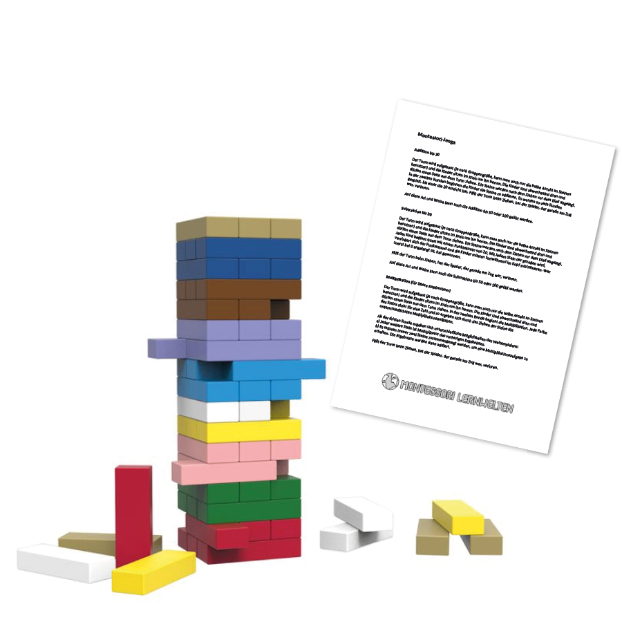 Jenga-Turm in den Montessori-Farben u.a. für die Addition und Subtraktion bis 20