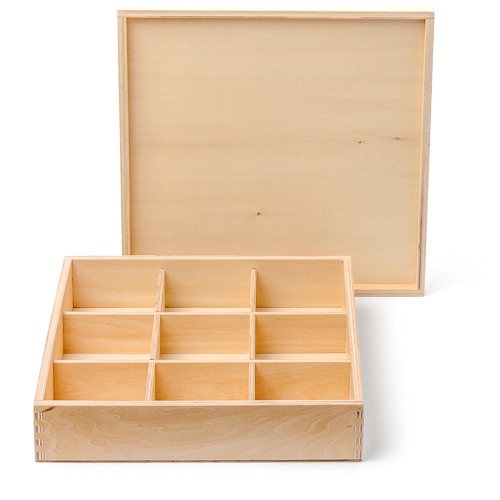 Holzkasten mit Deckel mit 9 Fächern und einem Deckel. Der Holzkasten ist 29x29x5,7 cm groß und die Innenmaße der einzelnen Fächer betragen 8,8 x 8,8 x 3,5 cm.