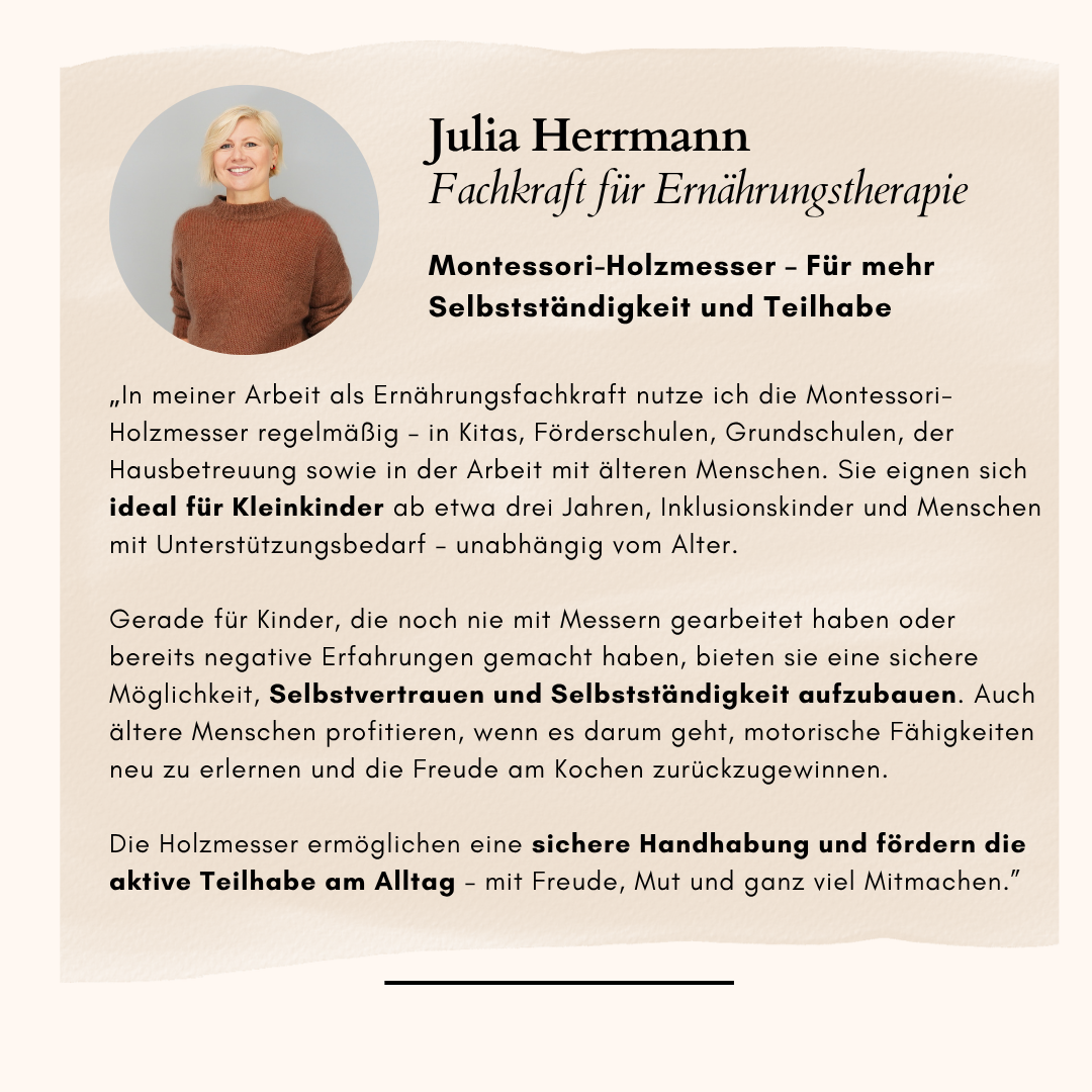 “Die Holzmesser ermöglichen eine sichere Handhabung und fördern die aktive Teilhabe am Alltag”, Julia Herrmann (Fachkraft)