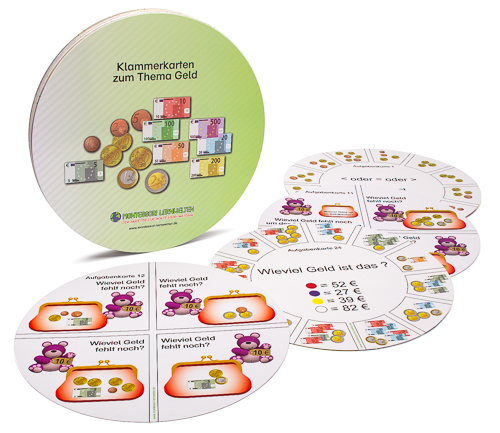 30 kreisrunde Klammerkarten zum Thema Geld