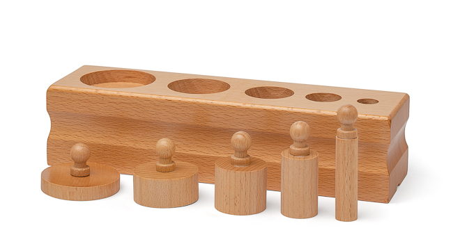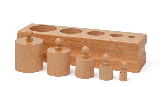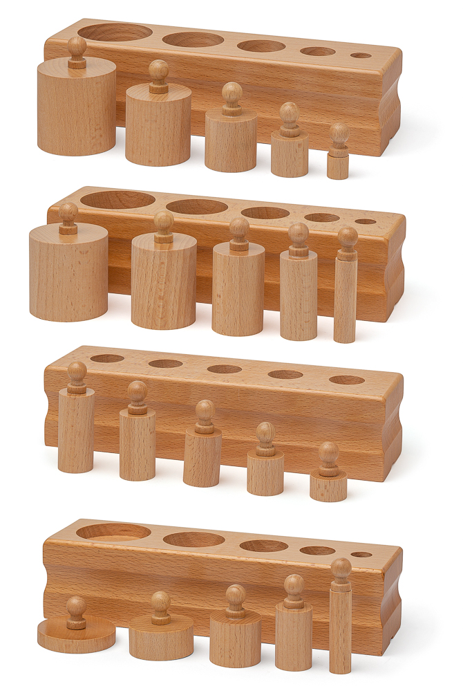 4 Holzblöcke mit je 5 Holzzylindern. Material zur Förderung der Größenwahrnehmung.