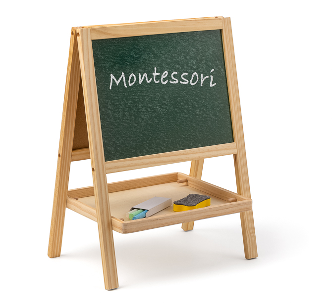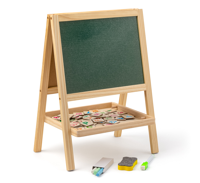 Die kleine und stabile Tafel hat eine klassische Schiefertafel zum Malen und Schreiben mit Kreide. Auf der gegenüberliegenden Seite befindet sich eine Magnetwand, an der Buchstaben, Zahlen, Verkehrszeichen usw. im Magnetform angebracht werden können.