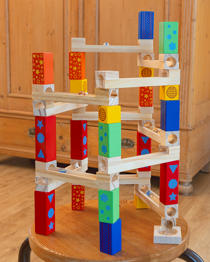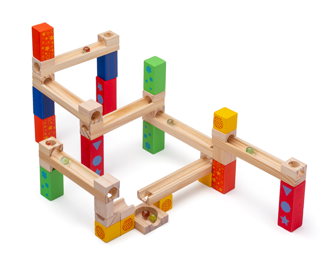 Ein Lieblingsstück unserer Spieleabteilung! 46 Holzbausteine fordern die Kinder heraus, Bahnen mit dem richtigen Gefälle zu konstruieren, so dass die Murmel mit Schwung in das Auffanglager rollt.