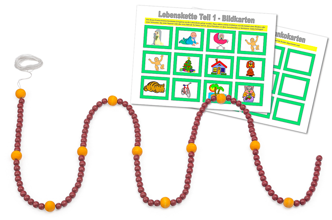 Wann bin ich geboren? Wann wird mein Brüderchen 2 Jahre alt? Wann komme ich in die Schule? Diese und weitere Fragen lassen sich mit der Lebenskette in eine zeitliche Abfolge bringen.