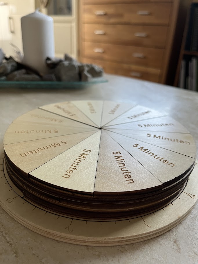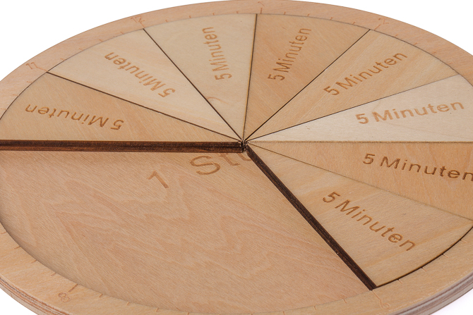 Diese Lernuhr besteht durch und durch aus Holz. Sie kommt sogar ganz ohne Aufdrucke aus, da alle Zeitangaben in das Holz eingraviert sind und so einen sehr ästhetischen Gesamteindruck vermitteln.