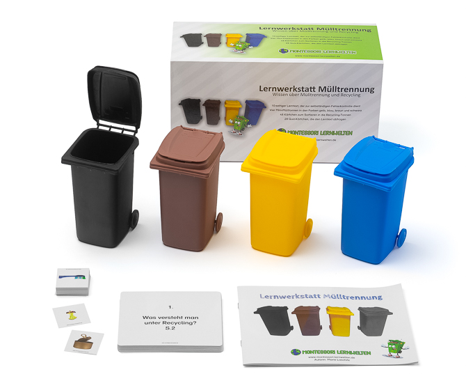 Die Lernwerkstatt „Mülltrennung“ gibt Antwort auf die brennende Frage unserer Zeit, wie wir das globale Müllproblem lösen können. Das Set besteht aus vier Mini-Mülltonnen, die ein reales Abbild der üblichen Müll -und Wertstofftonnen darstellen.