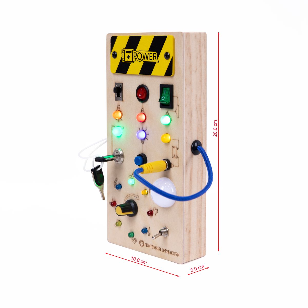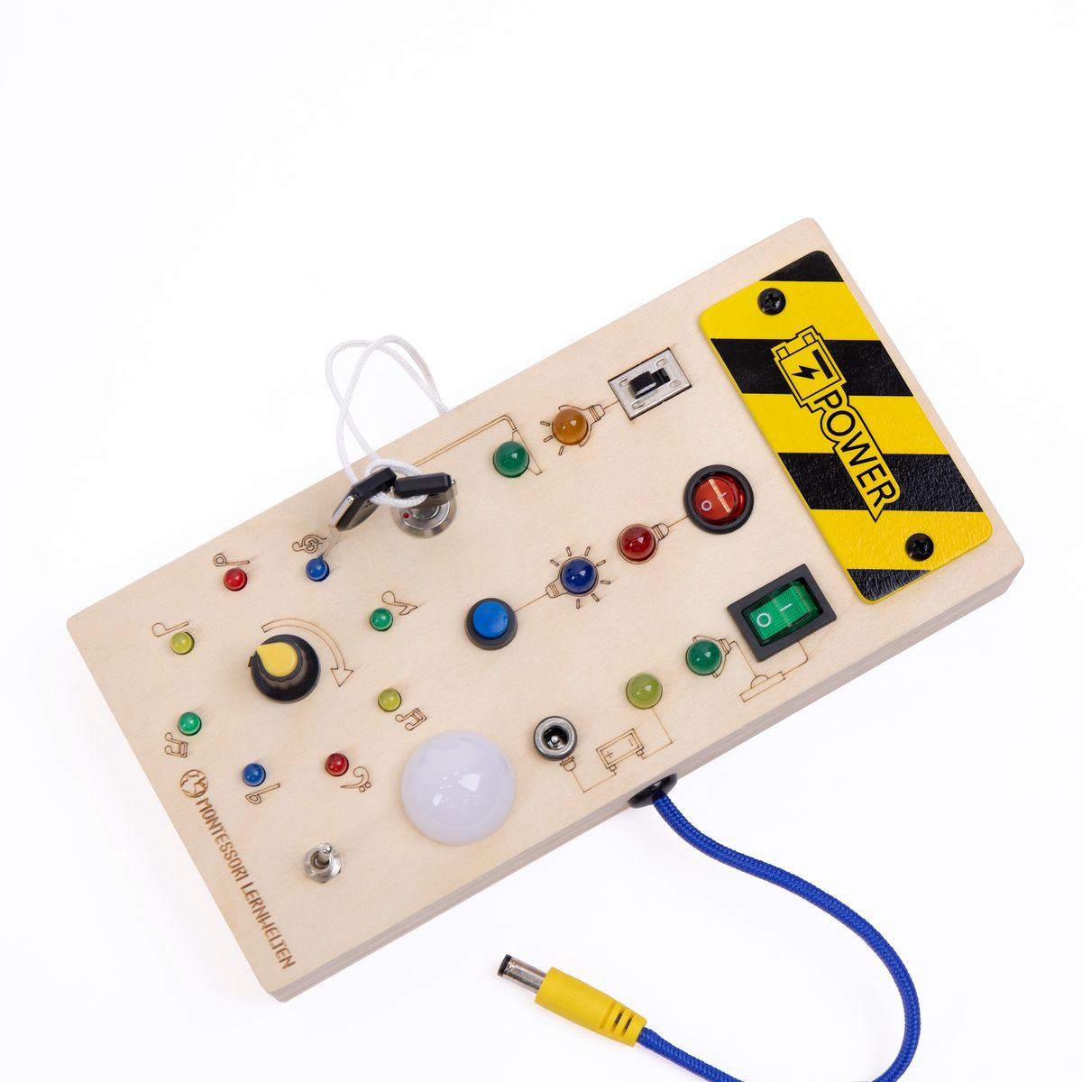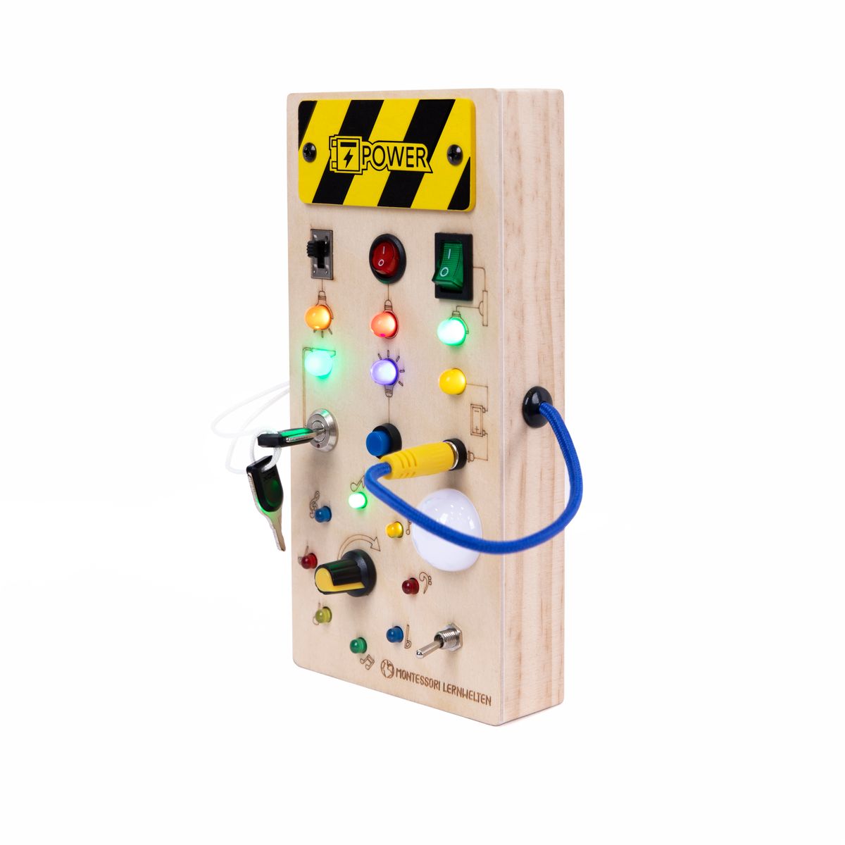 Das Montessori Busy Board bietet Kindern ganz unterschiedliche Typen von Schaltern, Steckern und Knöpfen an. So lernt das Kind spielerisch kennen, was es später bei “echten” elektronischen Geräten anwenden kann.