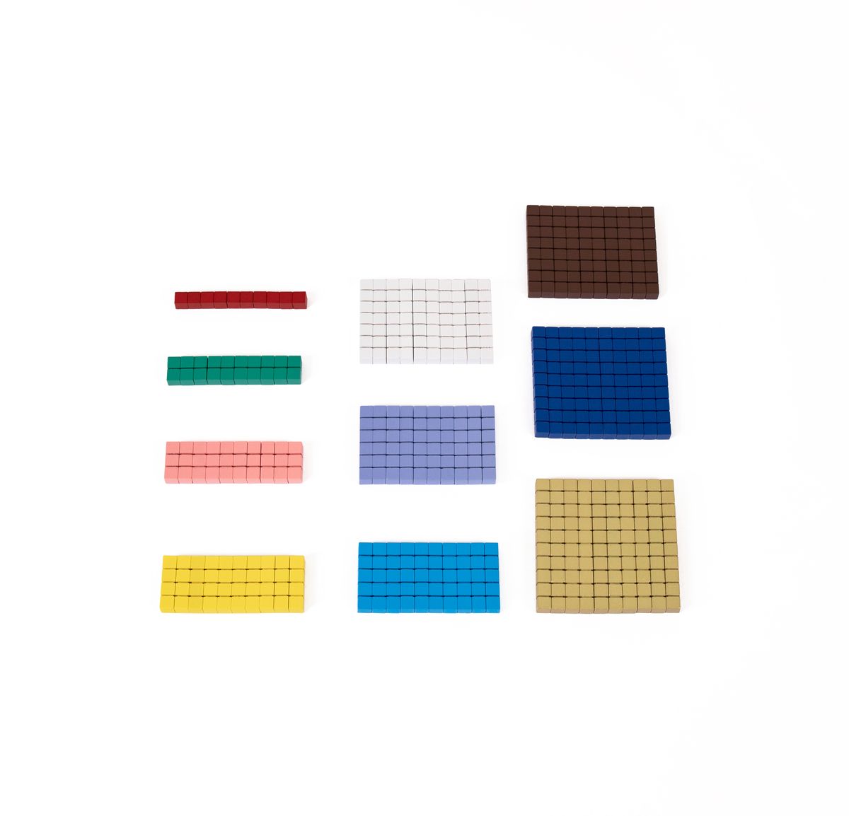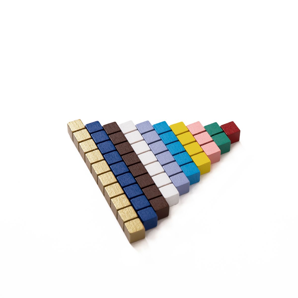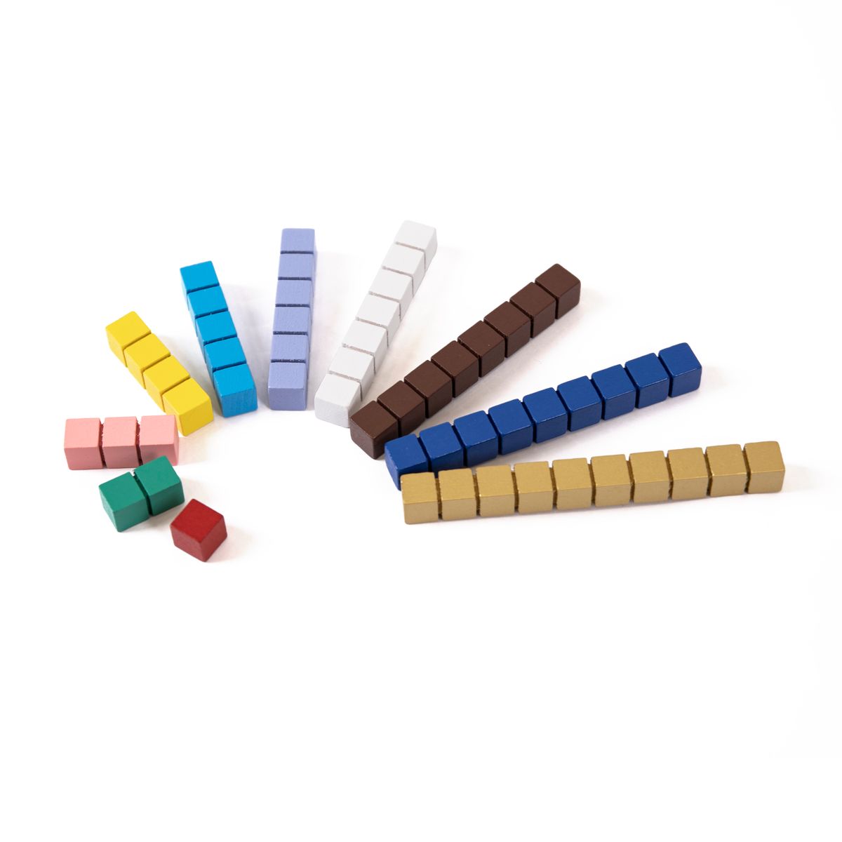 Die Montessori Rechenstäbchen symbolisieren die Zahlen von 1-10 nicht nur durch ihre Länge, sondern auch durch die entsprechende Montessorifarbe.