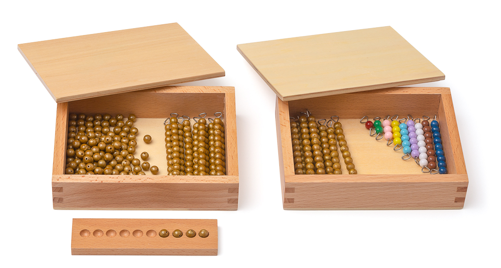 2 Kästen mit Perlenmaterial für die Arbeit mit den beiden Seguintafeln.
