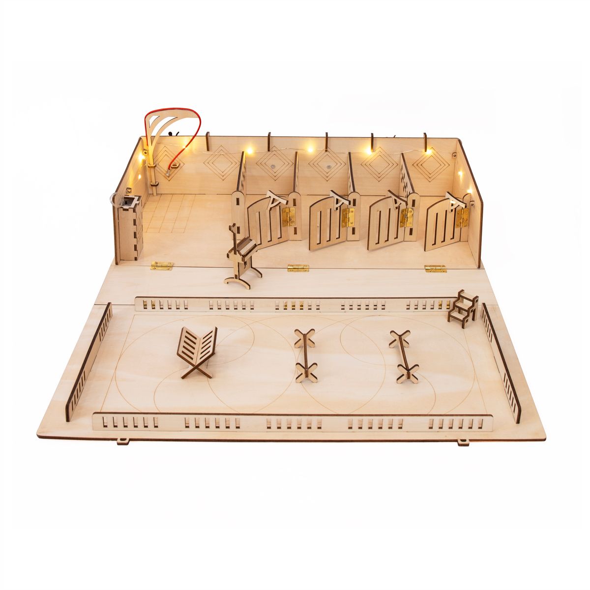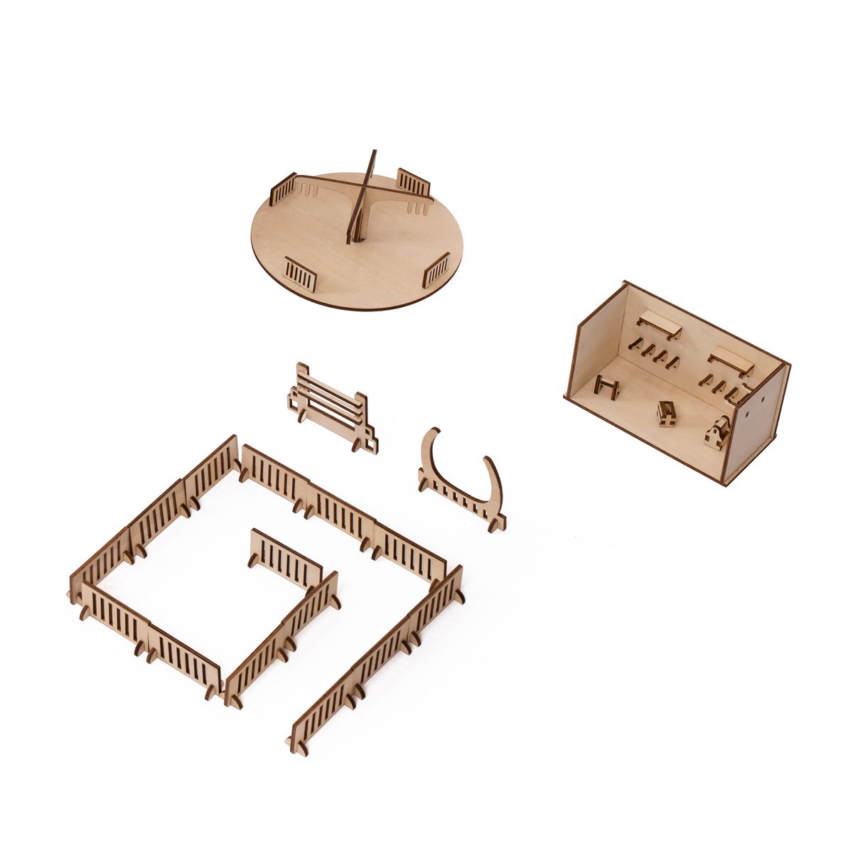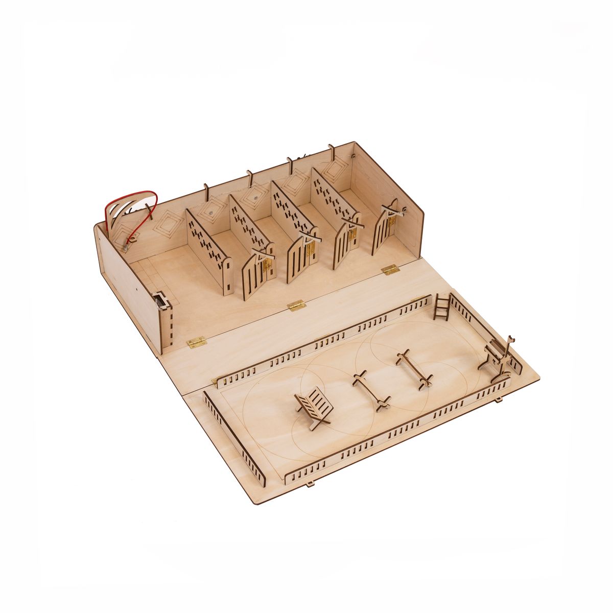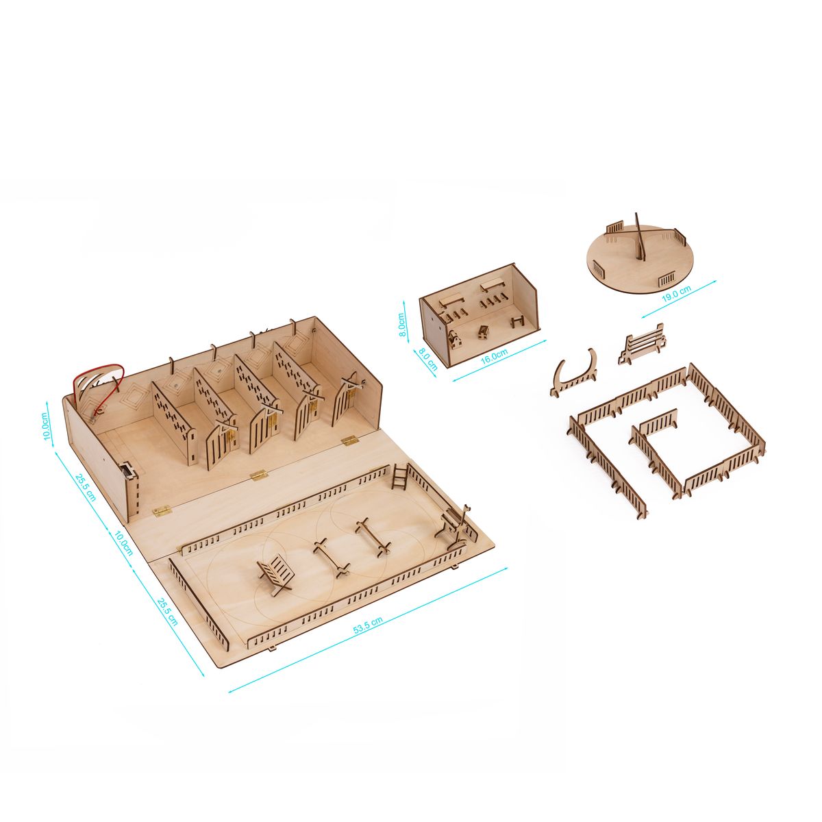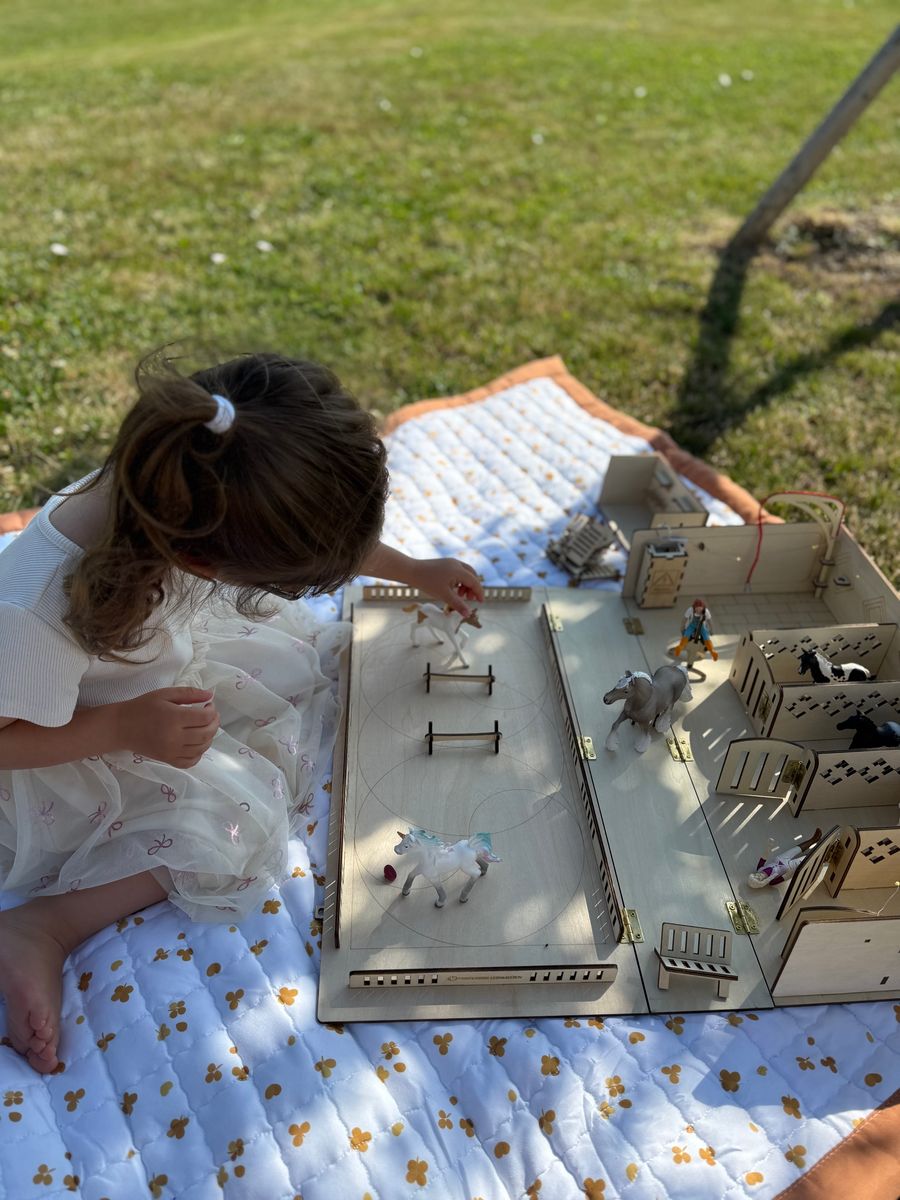Unglaublich, was in unserem Pferdestallkoffer alles Platz findet: Ein Pferdestall mit vier Einzelboxen und einem weiteren Raum für die Aufbewahrung der Sattel, Pferdepflege, An- und Absatteln sowie eine Koppel mit Hindernissen, beliebig erweiterbar, eine Pferdepflegestation und ein kreisrunder Reitplatz.