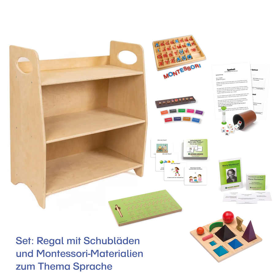 Dieses Regal ist gefüllt mit einer repräsentativen Auswahl an Montessorimaterialien für Sprache in der Grundstufe. Es enthält einen guten Überblick, was Montessori Schreib- und Leseanfängern zu bieten hat.