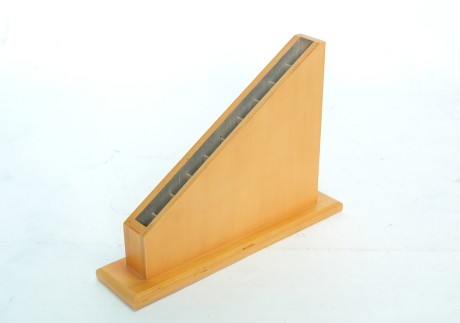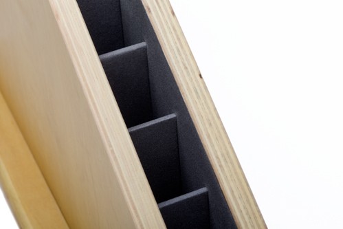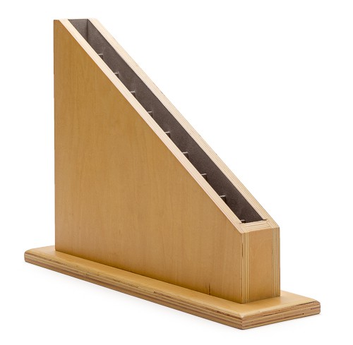 Holzständer mit separaten Kammern für jede Stange. Jeder Ständer ist genau für ein Stangen-Set ausgelegt.