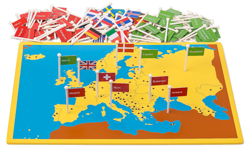 Holzkarte in der Größe 55,5 x 39 x 0,7 cm mit Fähnchen zum Benennen der Länder und Hauptstädte Europas