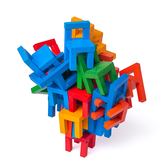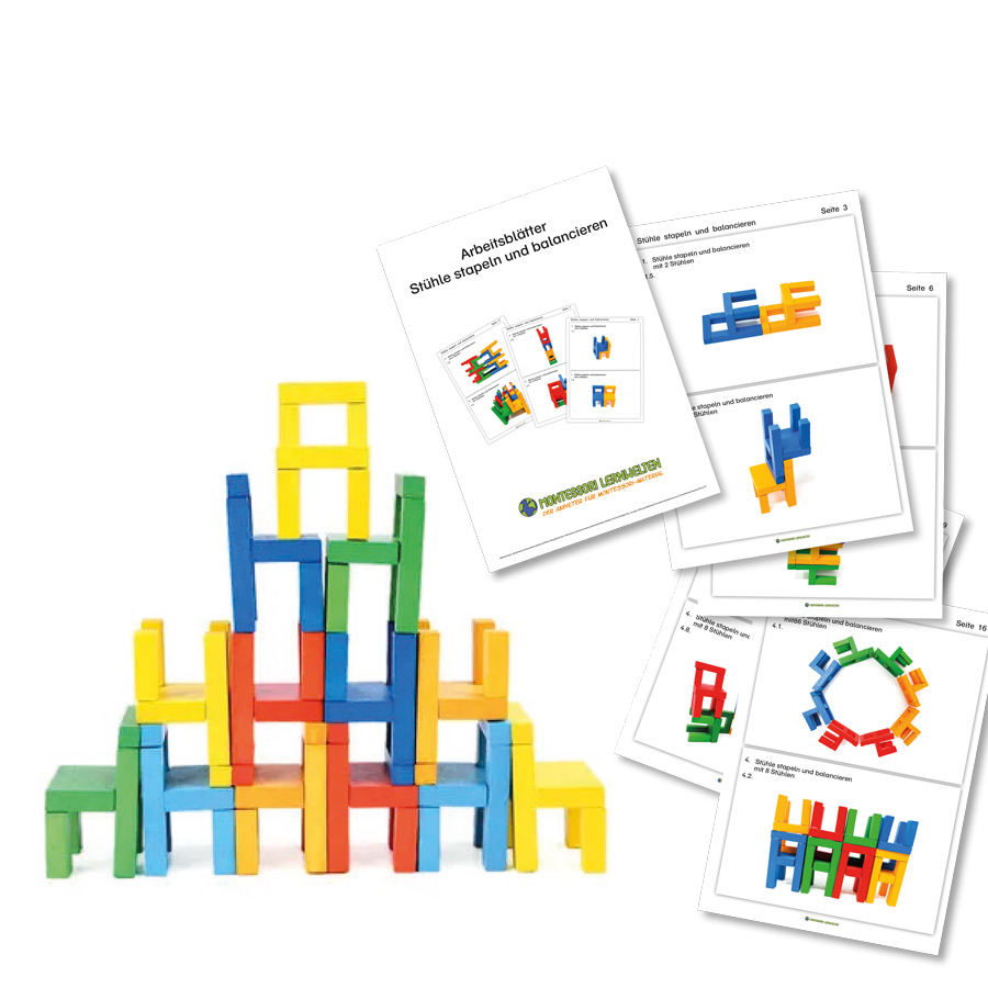 24 kunterbunte Stühle zum Aufeinanderstapeln mit 40 verschiedene Konstruktionen, die es nachzubauen gilt.