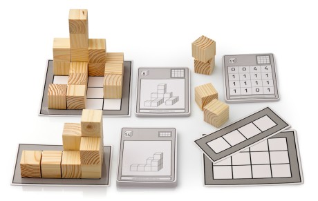 56 Arbeitskarten mit Würfelbauten und passender Selbstkontrolle sowie 64 Bauwürfel aus Holz.